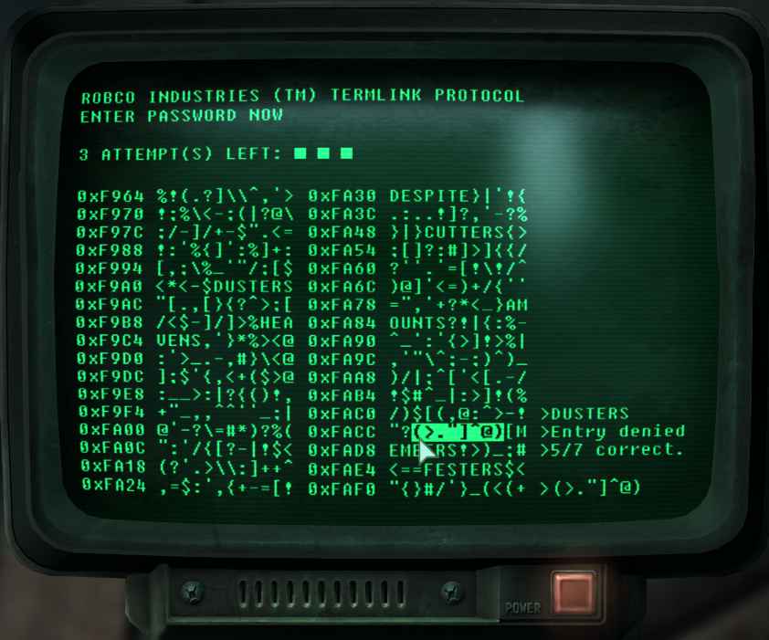 ハッキング画面で表示される文字列のどこかにパスワードが潜んでいます。クリックして選択すればOK。難易度が上がる毎に文字列の文字長が増える