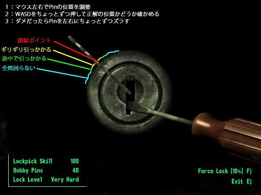 こじ開け(Force)の成功率はスキル100でVery Easy 100%/Average 60%/Very Hard 10%。Average位までならこじ開けなくても何の問題もなく開くし、Very Hardでは使い物にならない微妙な成功率。