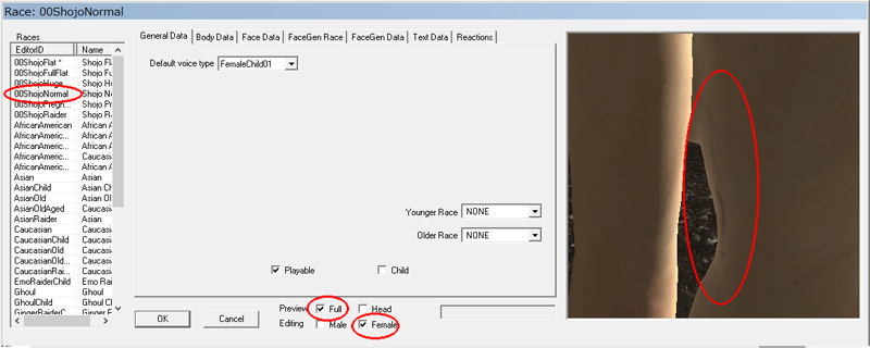 EditorIDの一覧から種族をクリックして選択。PreviewをFullにチェック。EditingをFemaleにチェックすると女性キャラの全身がプレビューできます。